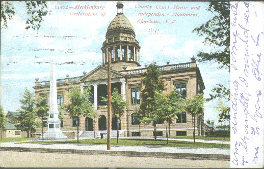 The Mecklenburg County Courthouse and the Independence Monument. Physical Description: 3x5 Publisher: Southern Postcard Company