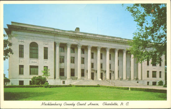 The fifth Mecklenburg County Courthouse is located at 700 East Trade Street. Built at a cost of one million dollars, it first opened in 1928. Physical Description: 3x5 Publisher: Dixie News Company