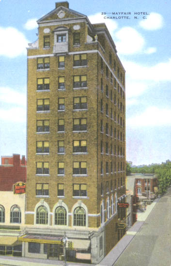 The Mayfair Hotel, now known as the Dunhill Hotel, is located at the corners of North Tryon and 6th Streets. Built by two local physicians, Dr. James Pleasant Mattheson and Dr. C.N. Peeler, the hotel opened its doors as the Mayfair Manor on November 15, 1929. Listed on the National Register of Historic Places, the hotel was designed by Louis Asbury. The Dunhill Hotel Associates restored the Mayfair to its present grandeur in the late 1980s, and changed its name. Physical Description: 3x5 Publisher: E. C. Kropp Company