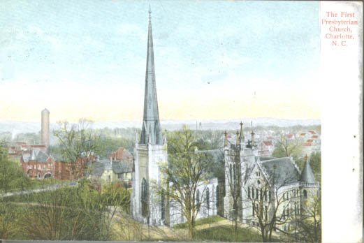First Presbyterian Church in Charlotte was organized in 1832. Originally a small church, this building was replaced on November 17, 1895 with this impressive structure. It is located at the corners of West Trade and Church Streets. It is one of the largest churches in the uptown area. Physical Description: 3x5 Publisher: International Post Card Company