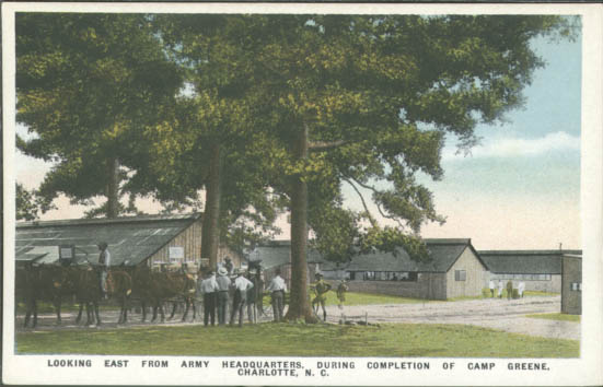 Camp Greene was a military training camp constructed in northwest Charlotte during World War I. Caption on postcards reads, `Scene looking east from Army Headquarters during completion of camp.` Physical Description: 3x5 color Publisher: Carolina Card Company