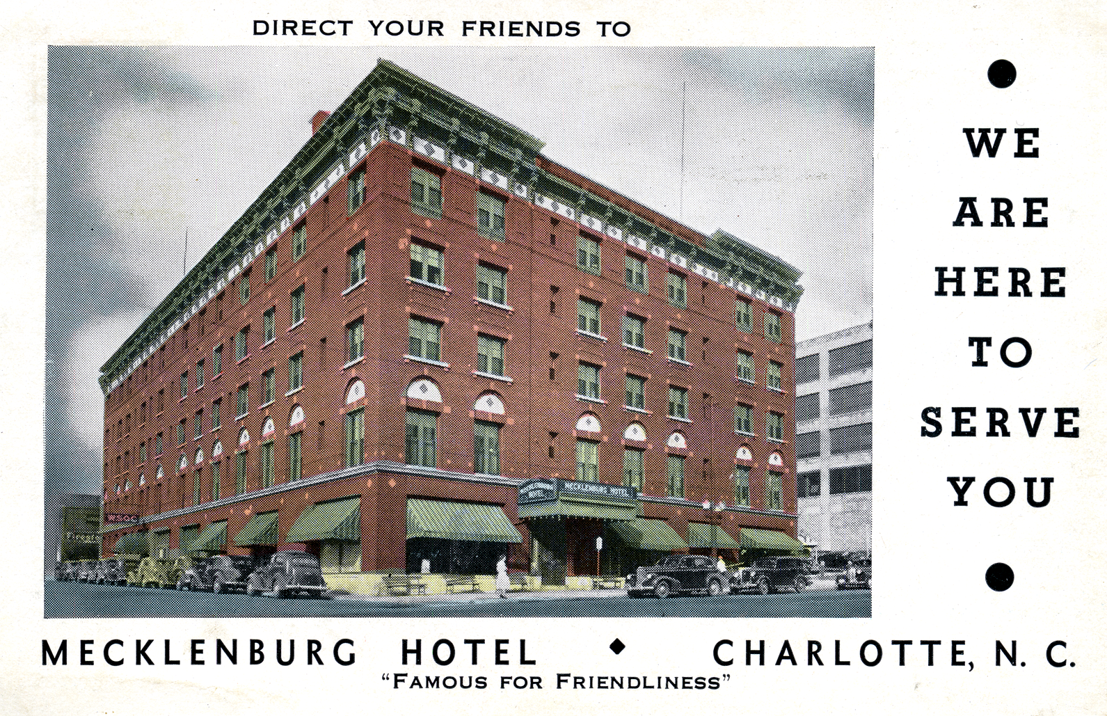 The Mecklenburg Hotel was located at 520-524 West Trade Street. It was built in 1914 by W.C. Petty.