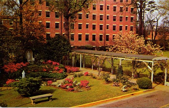 The shrine of Our Lady of Lourdes in the gardens of Mercy Hospital. Physical Description: 3x5 Publisher: Duke Photo Company