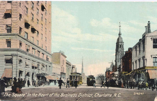 Intersection of Trade and Tryon Streets (Square) around the turn of the century. Physical Description: 3x5 Publisher: Leighton & Valentine Company