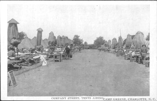 Airing tents along Company Street at Camp Greene, a World War I military training camp. Physical Description: 3x5 Publisher: A. M. Simon