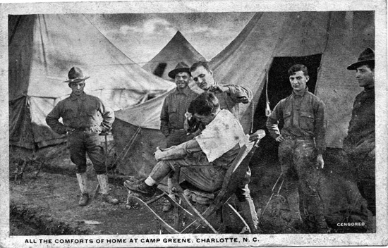 All the comforts of home at Camp Green, Charlotte, NC, Postcard shows soldiers being shaved. labeled censored Physical Description: 3x5 black and white Publisher: Unknown