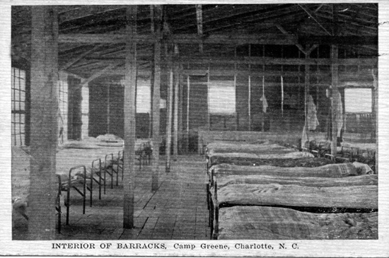 An interior shot of a Camp Greene barracks. Camp Greene was a World War I training base in Charlotte, North Carolina. Physical Description: 3x5 black and white Publisher: A. M. Simon