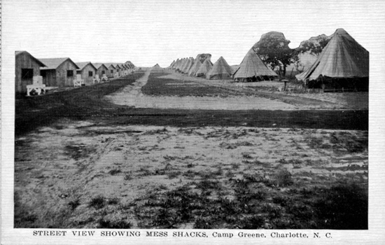 Street view at Camp Greene showing the Mess Shacks. Camp Greene was a World War I training base in Charlotte, North Carolina. Physical Description: 3x5 black and white Publisher: A. M. Simon