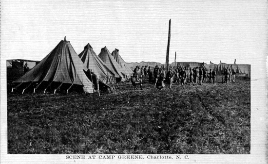 Scene at Camp Greene of men standing near their tents. Camp Greene was a World War I training base in Charlotte, North Carolina. Physical Description: 3x5 black and white Publisher: A. M. Simon