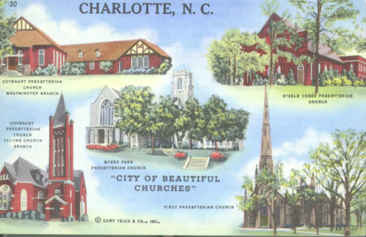 Postcard features images of Westminster Presbyterian, Second Presbyterian, Steele Creek Presbyterian, Myers Park Presbyterian and First Presbyterian Physical Description: 3x5 Publisher: Curteichcolor