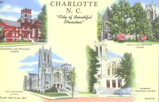Four Methodist churches in Charlotte: Hawthorne Lane Methodist, First Methodist, Myers Park Methodist, and Dilworth Methodist. Physical Description: 3x5 Publisher: Genuine Curteich