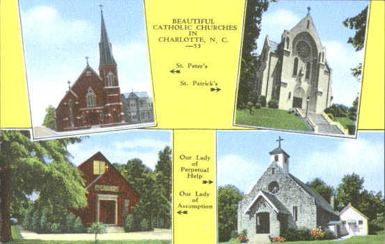 Charlotte's four Catholic churches in the 1940s, including St. Peter's, what is now the Cathedral of St. Patrick, Our Lady of Perpetual Help and our Lady of Assumption. Physical Description: 3x5 Publisher: E. C. Kropp Company