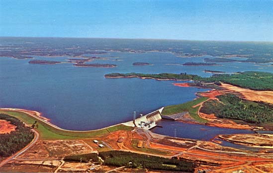 Aerial view of Lake Norman and Cowans Ford Dam. The mile-long hydro-electric dam was built by Duke Power, today Duke Energy. Lake Norman is the largest man-made lake in North Carolina. Physical Description: 3x5 Publisher: Asheville Postcard and Pennant Company