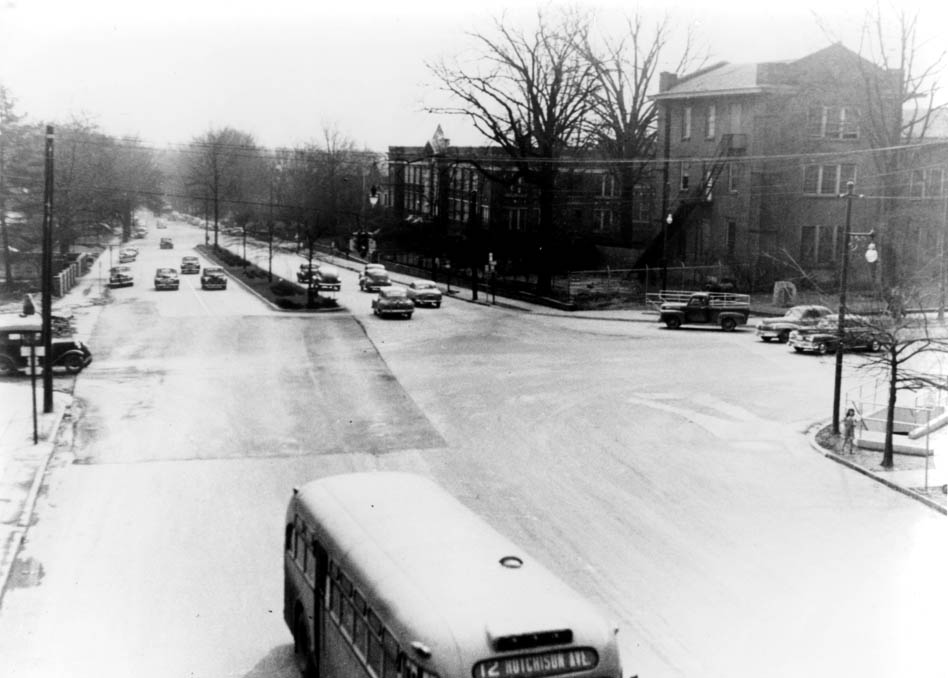 Looking east past the intersection of Morehead Street and South Boulevard. The end of one wing of the D.H. Hill School can be seen at the corner. The rest of it extended southward on South Boulevard. The Alexander Graham Jr. High School stands just beyond it, running eastward along Morehead Street. Physical Description: 8x10 glossy. Publisher: Unknown