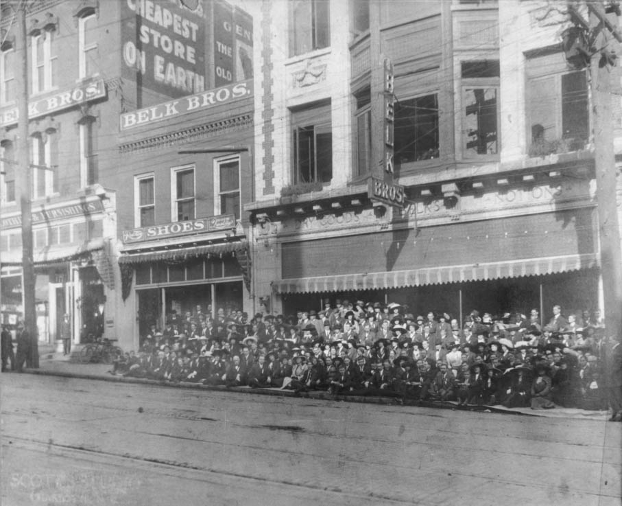 Employees of Belk Brothers in front of the entrance at 119 East Trade Street. Belk Brothers opened the Charlotte store on September 25, 1895. Physical Description: 8x10 glossy, 4x5 negative Publisher: Unknown.