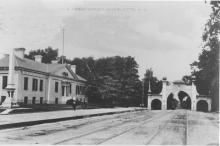 A view of West Trade Street pass the US Mint towards Graham Street. The gateway to the city is on the right and marked that side of the city. The Southern Railroad Passenger Terminal was beyond the gateway. Physical Description: 8x10 Publisher: Unknown