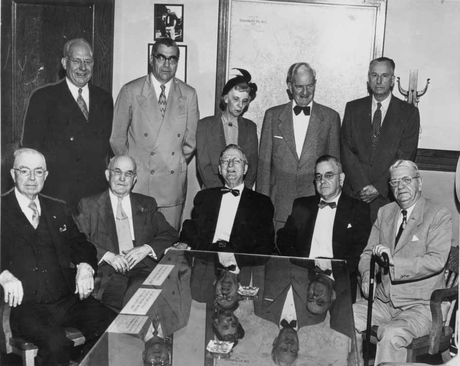 Group picture of Charlotte Civic Leaders: Sitting from left to right: S. M. Abernathy, U, R. Redd, George Wilson, Harvey Moore.Standing from left to right: Mayor Ben Douglas, H.H. Baxter, Unknown, Victor Shaw, Judge E. A. McCurrie. Physical Description: 8x10 glossy, 4x5 negative, Publisher: Unknown
