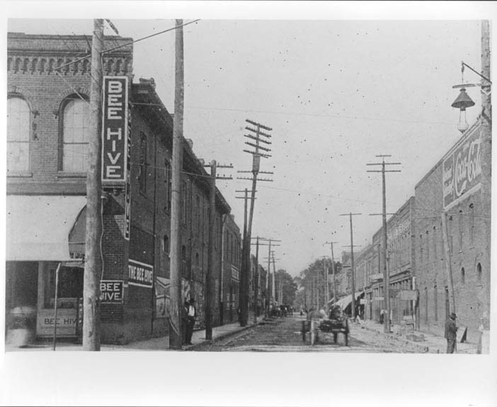 Looking north on College Street from the intersection with East Trade Street. The Bee Hive, on the left, was located at 43-47 E. Trade Street. It was a fashionable dry goods, clothing, shoes and millinery store. Physical Description: 8x10 glossy Publisher: Unknown