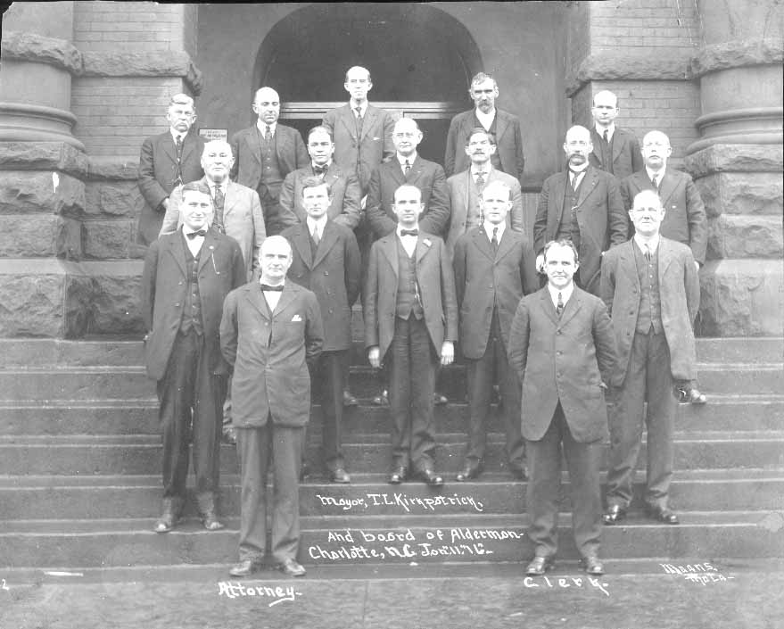 Mayor Thomas L. Kirkpatrick (1877-1946) and the Charlotte Board of Alderman posed for this picture on January 11, 1916. Kirkpatrick is in the center. Kirkpatrick served as Charlotte’s mayor from 1915-1917. Also in the photograph is town attorney, Herriot Clarkson (1863-1942) who later served on the North Carolina Supreme Court. The city clerk is Arthur H. Wearn. (1872-1956).