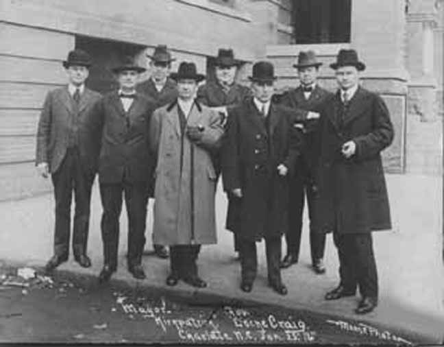 Charlotte Mayor T.L. Kirkpatrick (1877-1946) with North Carolina Governor Locke Craig (1860-1924) posed for this photograph on January 25, 1916. From left to right: Thomas L. Black (1863-1934), Justice Heriot Clarkson (1863-1942), Edmund Randolph Preston (1880-1957), Mayor Kirkpatrick, Dr. John Q. Myers (1877-1944), Governor Craig, Captain John A. Parker and Paul Cameron Whitlock (1878-1959). Physical Description: 8x10 glossy Publisher: Unknown
