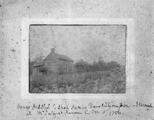 This is the earliest known print of McIntyre's Farm. When General Cornwallis invaded Mecklenburg County in 1780, a number of skirmishes between the local rebels and the British troops took place. The Battle of McIntyre's Farm took place on October 3, 1780. The log farmhouse was located on Beatties Ford Road. Cornwallis and his forces withdrew from Mecklenburg County on October 12, 1780. This image was made on April 25, 1934. This albumen print of McIntyre's Farm was taken during a picnic in the summer of 1900 when the Mecklenburg Chapter of the Daughters of the American Revolution placed a marker on this site. One year later in October, a monument replaced the maker. Physical Description: Albumen Publisher: Unknown