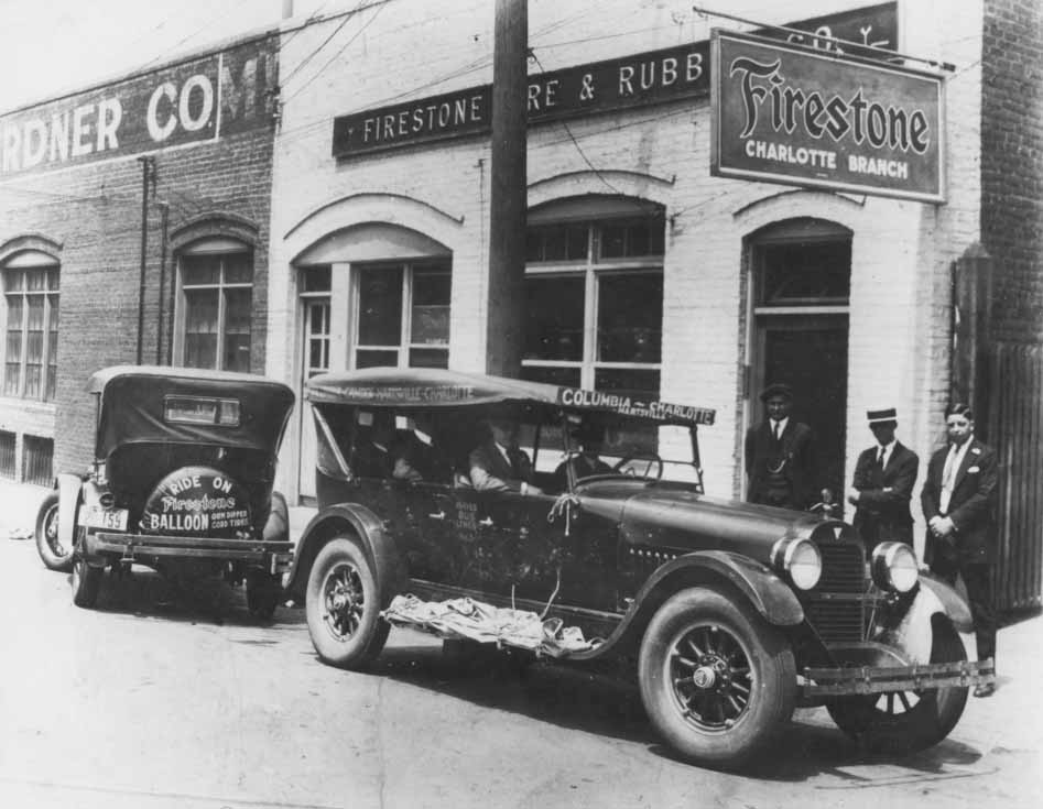 Hayes Bus Lines ran from Charlotte, North Carolina to Columbia, South Carolina. This photograph was taken in front of the Firestone Tire & Rubber company on 5th Street. Physical Description: 8x10 glossy - 4x5 negative - 2 copies Publisher: Unknown.