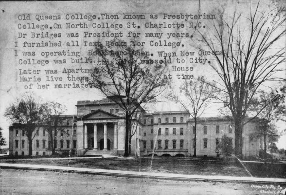 Presbyterian College was located on North College Street. The school changed its name to Queens College (now university) and moved to Selwyn Avenue in the Myers Park neighborhood. Converted to apartments, this building and others have since been demolished. Physical Description: 8x10 glossy, 4x5 negatives - 2 copies Publisher: Unknown