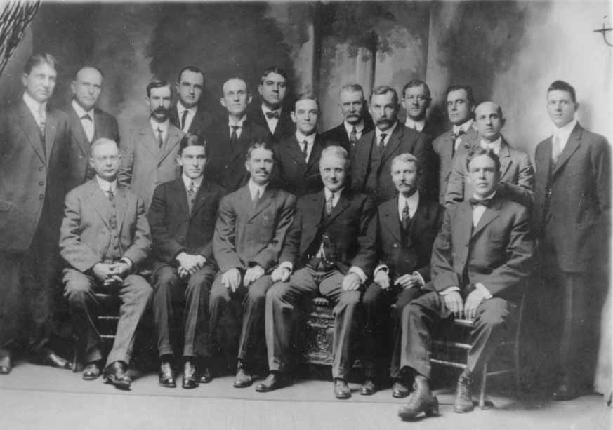 Scottish Rite Consistory Class posed for this portrait on November 17, 1916. Standing: B. F. Withers, Sr., C.O. Kuester, J.A. Yarbrough, A. J. Crampton, Bob Keelser, Seated: Bob Hardage, W.S. Liddell, Baxter Ross (Others not identified.) Physical Description: 4x5 negative, Publisher: Unknown.