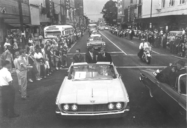 Senator John F. Kennedy during the 1960 Presidential campaign. Police Chief, George Stephens drive the car. North Carolina Governor Luther Hodges is in the front passenger seat. Back seat, left to right: David Clark and Senator Kennedy. Physical Description: 8x10 glossy Publisher: Unknown