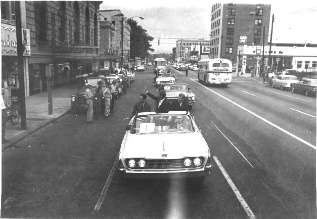 Senator John F. Kennedy during the 1960 Presidential campaign. Police Chief, George Stephens drive the car. North Carolina Governor Luther Hodges is in the front passenger seat. Back seat, left to right: David Clark and Senator Kennedy. Physical Description: 8x10 glossy Publisher: Unknown
