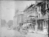 View of Charlotte street scene featuring horse-drawn wagons and two women walking along the sidewalk under a parsol.