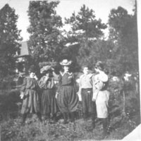 Five Elizabeth College students in gymnastic attire posing outdoors. Caption reads, Aflir Gymns.
