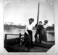 Two Elizabeth College students and a young man appear to be disembarking a small boat.