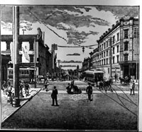 Etching of Indpendence Square, the intersection of Trade and Tryon Streets in 1909, from the Mecklenburg Declaration of Independence Souvenir Edition. The original is in the Carolina Room.