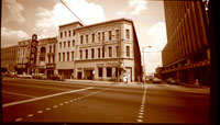 A picture of the Home Federal Savings and Loan Building prior to its demolition in 1965. Located at the corner of Fourth and Tryon Street, the photograph was taken on April 1, 1965. This building was once the Buford Hotel.