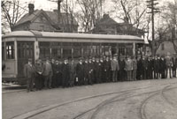 A group of dignitaries whorode the last streetcar in Charlotte posing in front of a streetcar. Taken in March 1938.