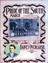 Sheet music cover of the song Pride of the South March: Dedicated to the Queen City Drum Corps of Charlotte, NC by Harvey Overcash. Framed print in the the Robinson-Spangelr Carolina Room Music Archives and the original sheet music is housed in the vault.