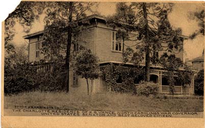 The Charlotte residence of Zebulon B. Vance, who was both the Governor of North Carolina during the Civil war and later a United States Senator.