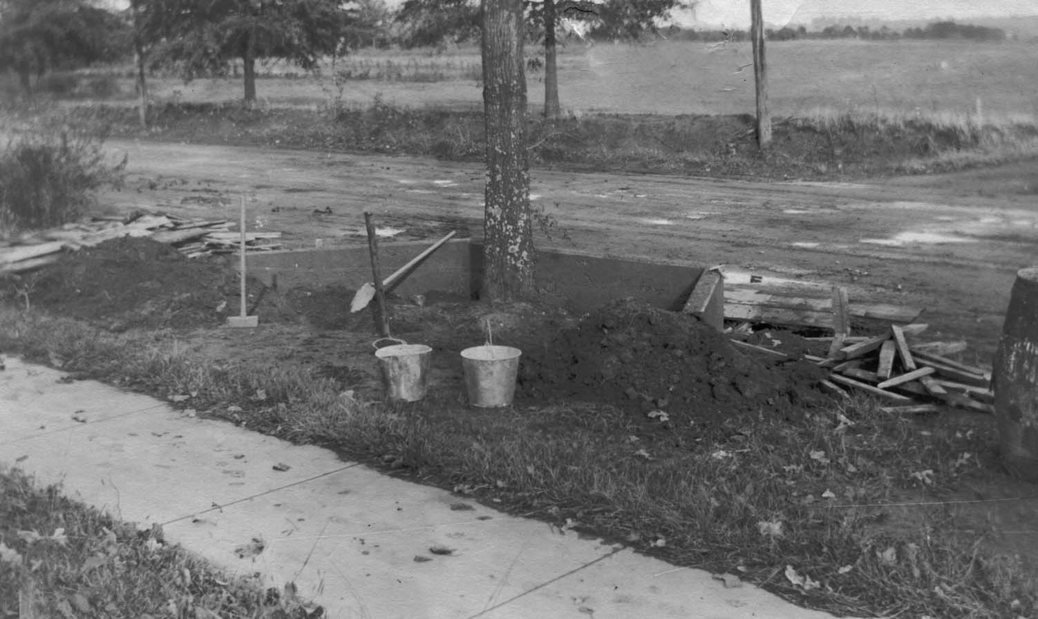 Image of workers' tools around a freshly planted oak tree. Physical Description: 5x3mage very faded. Two holes at top of image. Publisher: Unknown