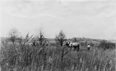 Man with mule in field probably working on landscape at Myers Park. Physical Description: 5x3 Tear on left side of print has been repaired. Bottom right corner has obvious fold. Publisher: Unknown
