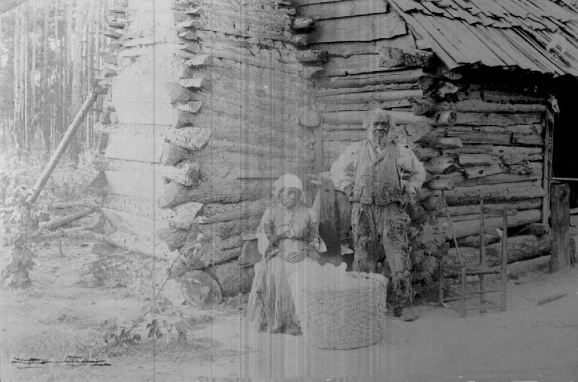 Uncle Issac and his wife (name unknown) in front of their cabin. Physical Description: 4x5 negative Publisher: Unknown