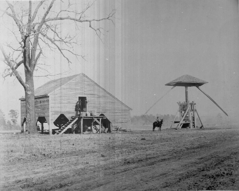Cotton gin house with the cotton screw/press on the right. A typical gin house like this produced three bales of cotton a day. Physical Description: 4x5 negative Publisher: Unknown