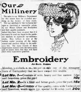 Many, many hours went into making a hat such as the one this lady is wearing. At this time, hat makers or milliners decorated their creations with feathers, fake and real flowers, berries, leaves, and even stuffed birds.  Ladies would purchase a basic hat and the more accessories requested for the hat, the higher the price.