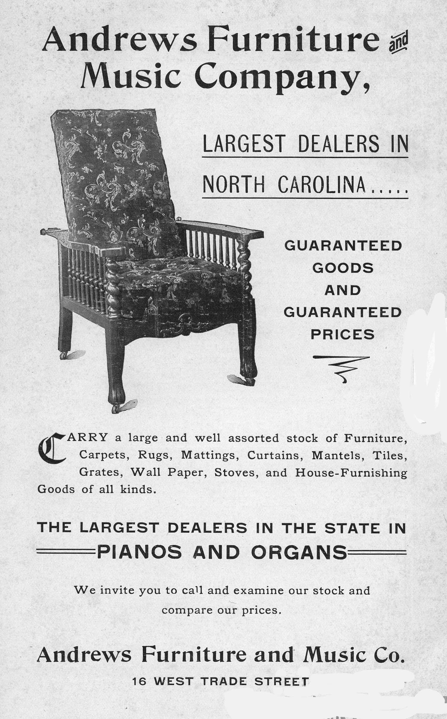 The turn of the century marks the beginning of the Edwardian period in architecture and furniture design. Elaborate wood carvings and heavy fabrics are very popular. The Andrews Furniture and Music Store carried a wide array of futniture and organs. Most homes had an organ from the late 1800s until the 1920s when pianos became more popular. Andrews was located at 16 West Trade Street. Today, the Andrews Music Store building is on North Tryon Street next to the Dunhill Hotel.