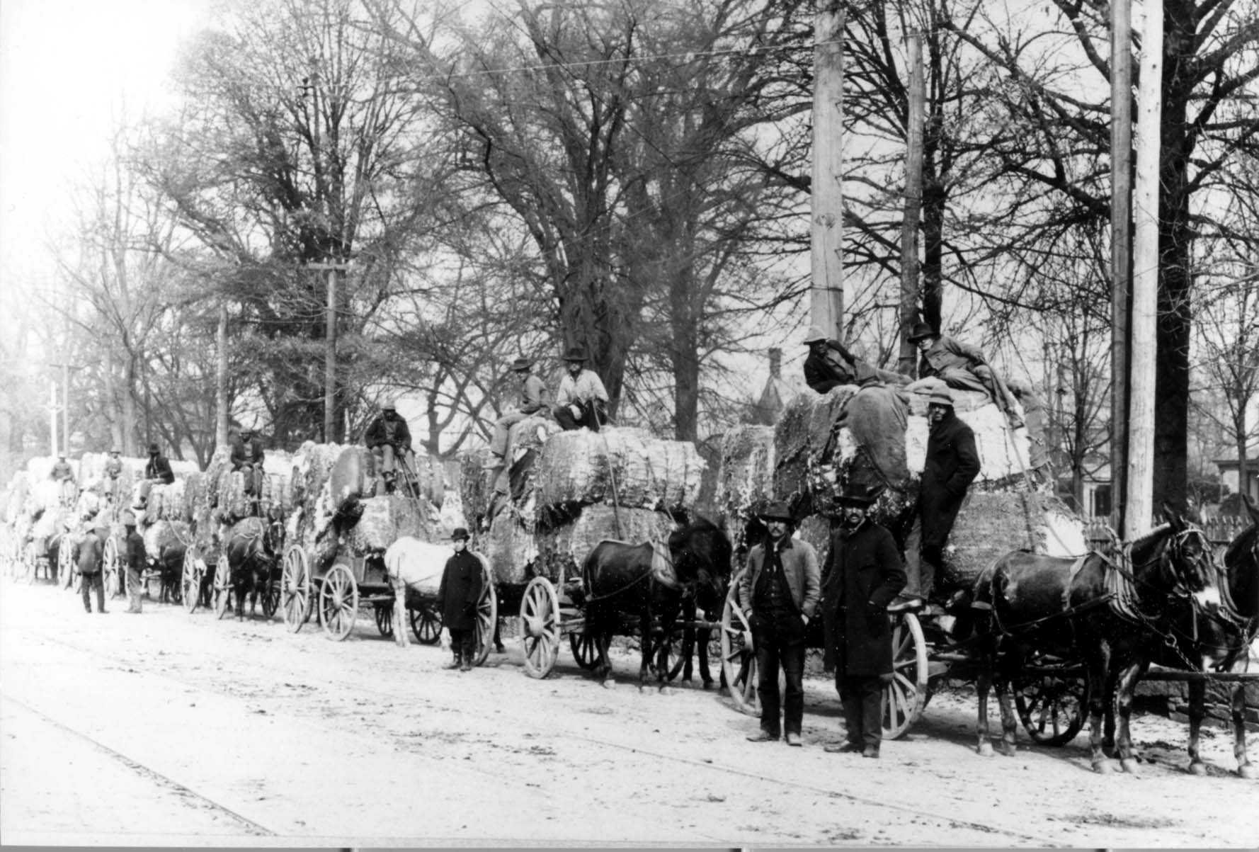 Cotton was a major cash crop in Mecklenburg County. To harvest the crop in the early 1900s, farmers  hired temporary laborers to handpick the cotton Some of the cotton would be pressed for the oil in a cotton press like this one. Bales of cotton was hauled by large wagons to the nearest railroad depot and othen by rail to textile mills  in Charlotte and throughout the state.