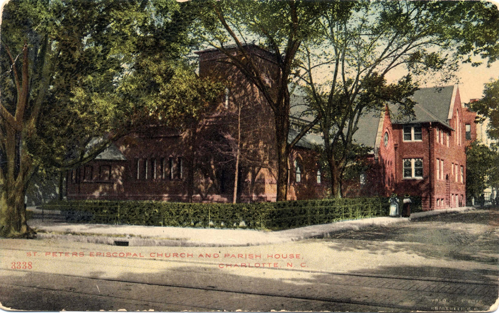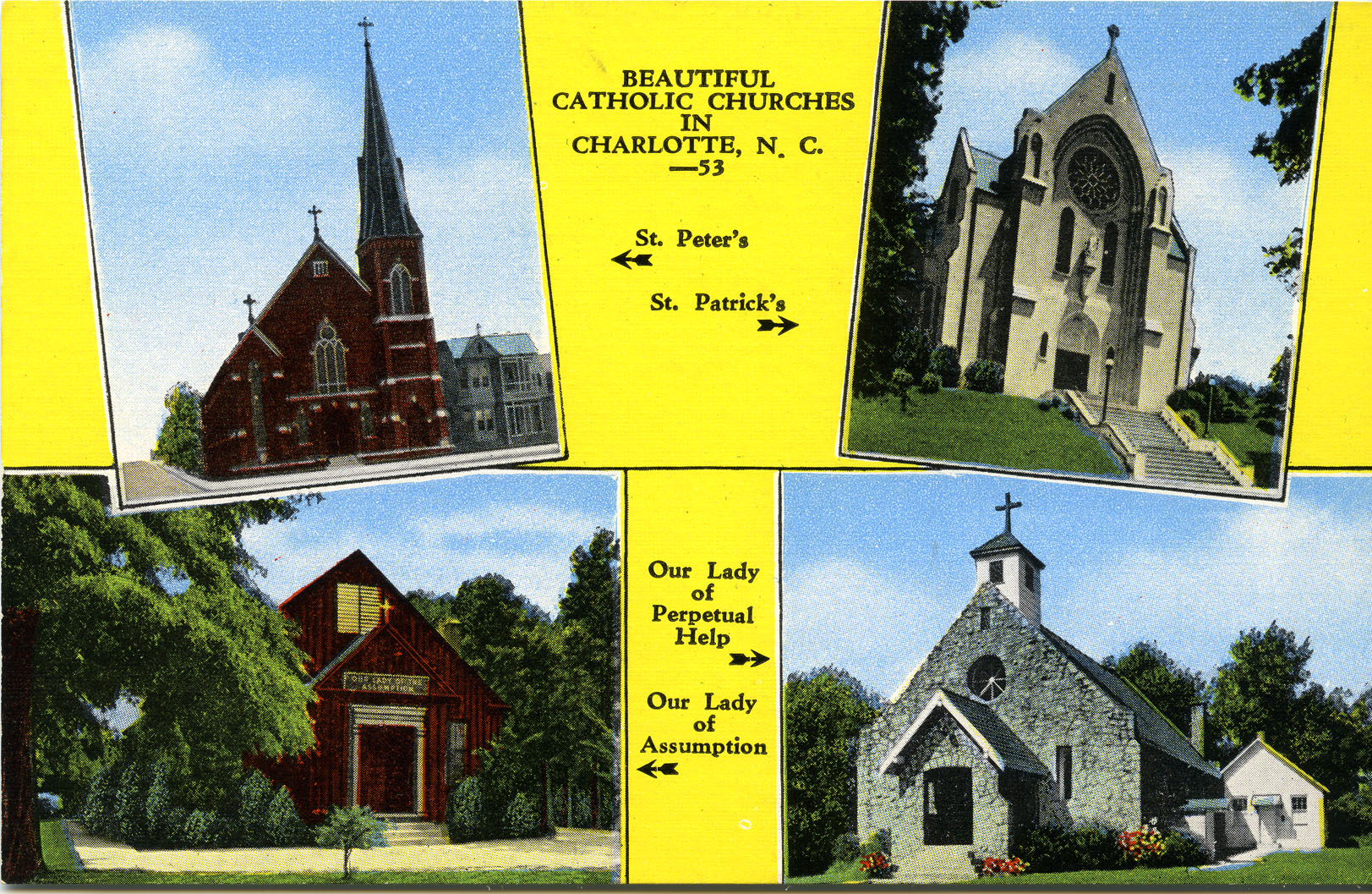 St. Peter’s Episcopal Church began as a mission in 1834. It becomes a parish of the diocese ten years later. This is the second building for this church. Located on the corner of North Tryon and West 7th Streets, it was built between 1857 and 1858. St. Peter’s Catholic Church is in the upper left hand corner of this postcard. The parish formed in 1851. This particular church building was completed in 1892.