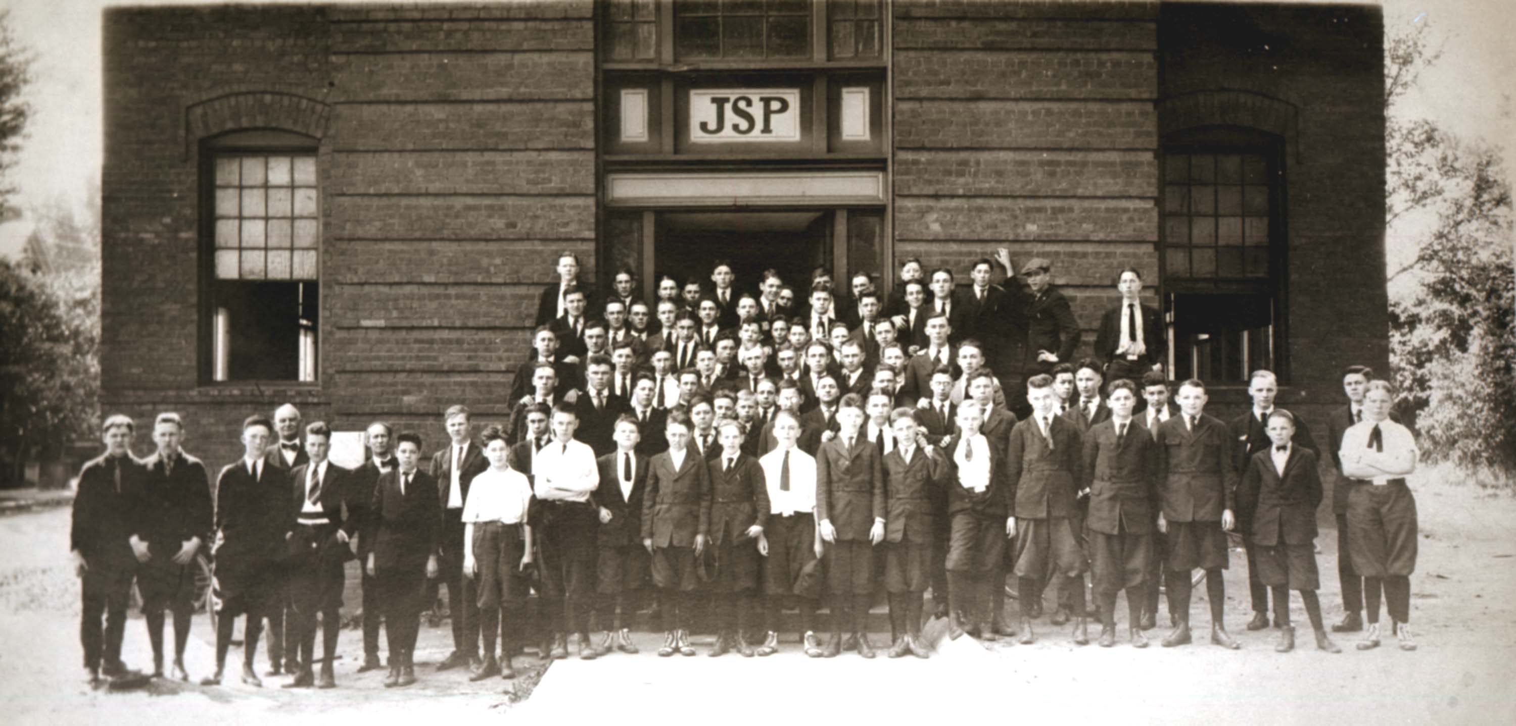 The Baird School for Boys was run by Major J.G. Baird of South Carolina who purchased the wooden building once used by the Macon School for Boys, which closed in 1890. Originally, Baird called the school the Charlotte Military Institute because military tactics were taught at the school. Later he erected the brick building seen here, which was on Poplar Street and changed the name to the Baird School for Boys. The school continued from 1890 until his death in 1927. The initials "JSP" over the entrance way refers to the Latin phrase Juvenes Spes Patriae, which translated means, “Young Men, Hope, Country.”