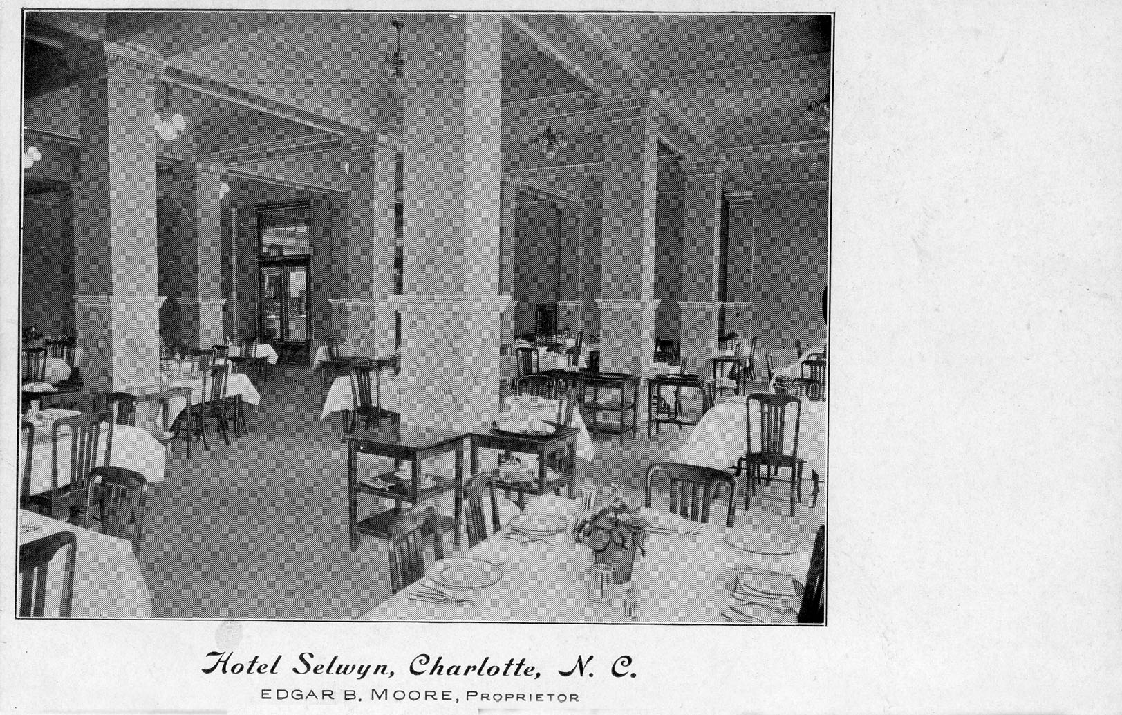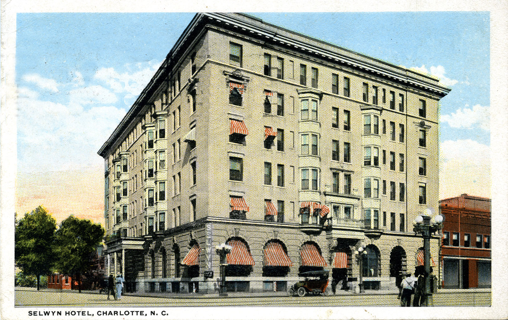In 1907, The Highland Hotels Company opened the fabulous six-story Selwyn Hotel. Designed by Atlanta architect, Willis F. Denny (1874-1905), who died before the building was completed, the Selwyn was an enormous hotel located on the northeast corner of West Trade and North Church Streets. It was the city's first fire-proof building.The hotel was designed to attract tourists as well as business men. Of the 150 rooms, 75 had a private bath, which was rarity at the time. Other ammenities at the Selwyn included a in-house barber shop, long-distance phone booths as well as telephones in each room, a newsstand, electric lights, a pool room, an ice plant, the telegraph office and a Turkish bath. It's dining room attracted local Charlotteans as well as hotel guests.
