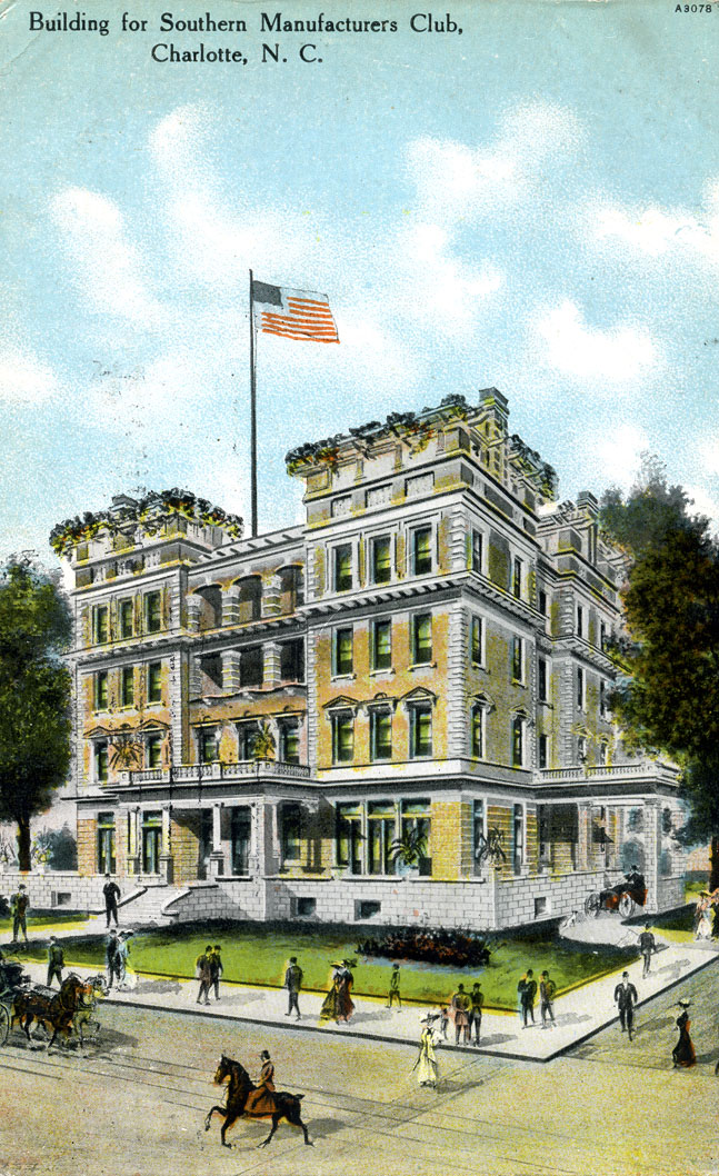 The Southern Manufacturers Club, an all men’s club organized in 1894. Fourteen years later in 1908, work began on this handsome building, designed by C.C. Hook, at 134 West Trade Street at a cost of $100,000. Living quarters for the single members were located on the third floor. Some of Charlotte’s most prominent businessmen call this home.