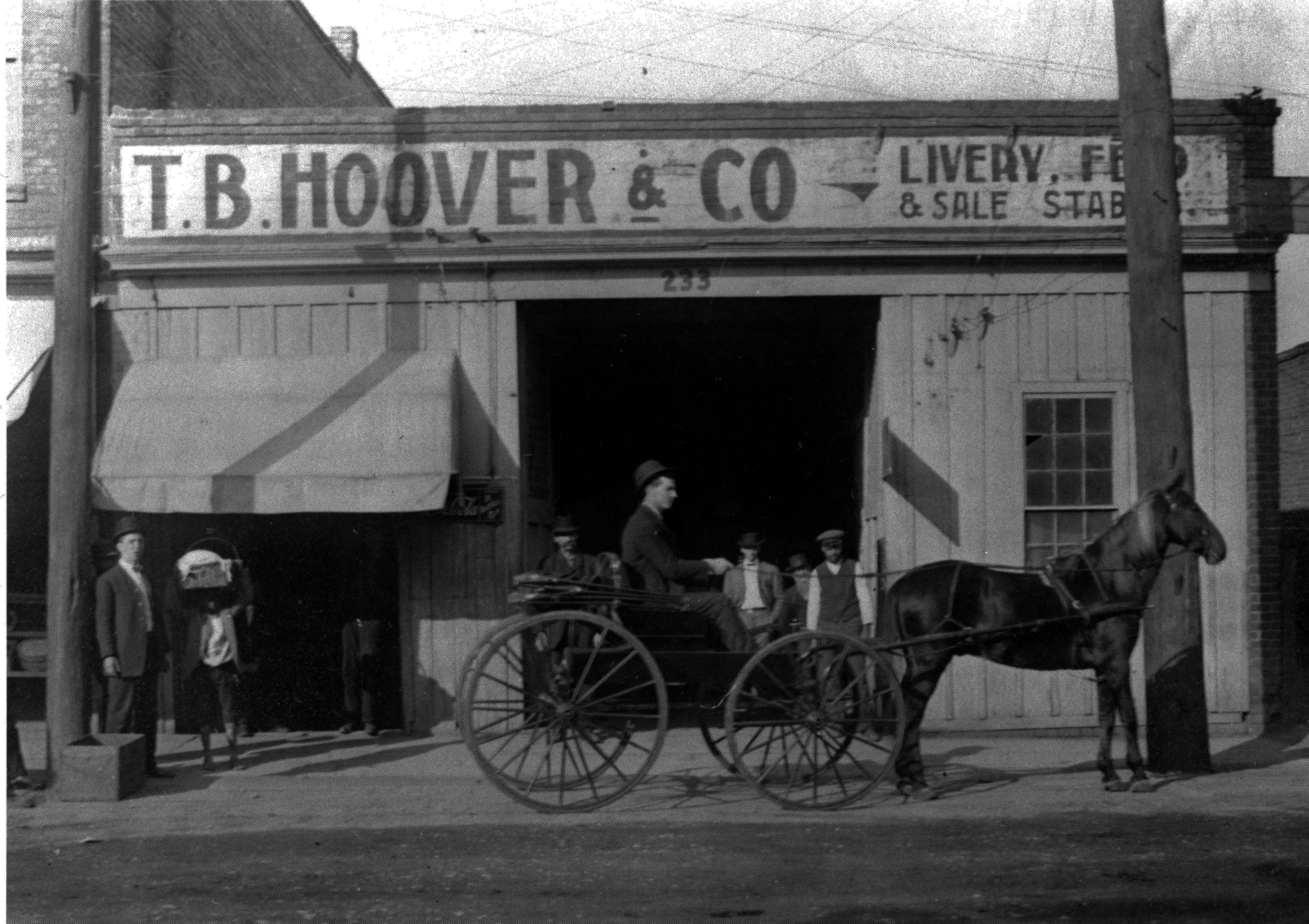 The turn-of-the century and the automobile brought about an end to livery stables as they quickly became replaced with automobile garages. Thomas B. Hoover is driving one of his carriages. His livery stable was located at 233 Wast Trade Street. (By 1911, the address changed to 239 East Trade Street.) Most families have their own horse and carriage or they rent them from one of the eight local stables.